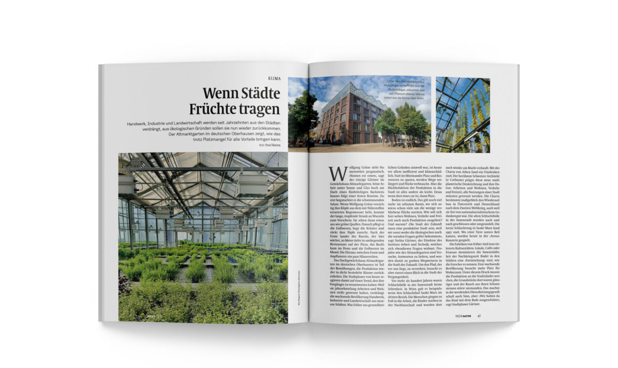 Das Dachgewächshaus Altmarktgarten im deutschen Oberhausen ist Teil der Bemühungen, die Produktion wieder in dicht besiedelte Räume zurückzuholen. Die Stadtplaner von heute reagieren damit auf einen Trend, den ihre Vorgänger zu verantworten haben: Weil sie jahrzehntelang Arbeiten und Wohnen strikt getrennt haben, verdrängt die wachsende Bevölkerung Handwerk, Industrie und Landwirtschaft aus unseren Städten. Was früher aus gesundheitlichen Gründen sinnvoll war, ist heute vor allem ineffizient und klimaschädlich. Statt im Miteinander Platz und Ressourcen zu sparen, werden Wege verlängert und Fläche verbraucht. Aber die Rückholaktion der Produktion in die Stadt ist alles andere als leicht. Denn wenn dort eines rar ist, dann Platz.