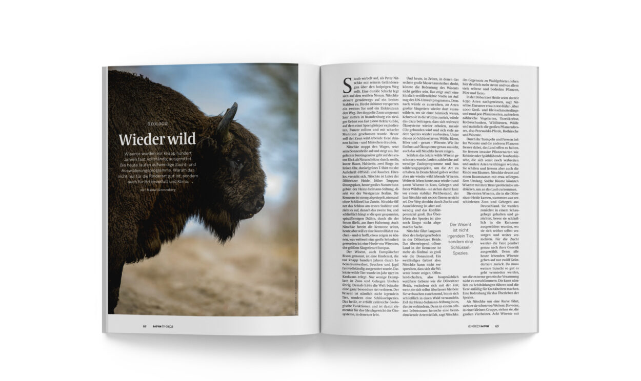 Nitschke stoppt den Wagen, setzt seine Sonnenbrille auf und steigt aus. Der gelernte Forstingenieur geht auf den ersten Blick als Naturschützer durch: weiße, kurze Haare, Halskette, zwei Ringe im linken Ohr, dunkelgrünes T-Shirt mit der Aufschrift ›HYGGE‹ und Raucher. Filterlos, versteht sich. Nitschke ist Leiter der Döberitzer Heide, früher Truppenübungsplatz, heute großes Naturschutzgebiet der Heinz-Sielmann-Stiftung, direkt vor der Westgrenze Berlins. Die Kernzone ist streng abgeriegelt, niemand ohne Schlüssel hat Zutritt. Nitschke öffnet das Schloss am ersten Stahltor und zieht es auf, danach das zweite Tor, und schließlich hängt er die quer gespannten, spiralförmigen Drähte, durch die der Strom fließt, aus ihrer Halterung. Auch Nitschke betritt die Kernzone selten, heute aber will er eine Kontrollfahrt machen – und er hofft, etwas zeigen zu können, was weltweit eine große Seltenheit geworden ist: eine Herde von Wisenten, der größten Säugetierart Europas.