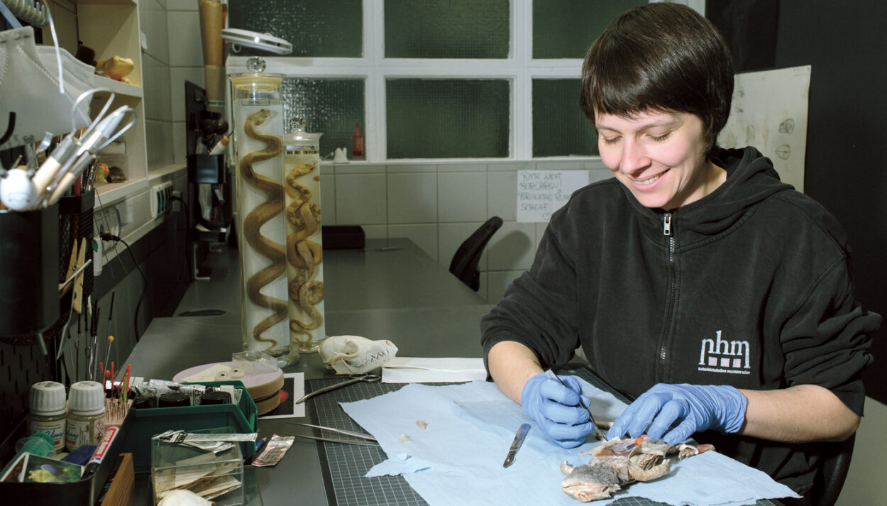 Im Naturhistorischen Museum, wo ich arbeite, nutzen wir verschiedene Methoden. Mit Alkoholpräparaten können wir Tiere für die nächsten tausend Jahre erhalten. Außerdem machen wir Bälge, also konservieren nur Haut und Federn. ›Ausstopfen‹ sagen wir nicht mehr, heute nähen wir die Haut auf ein gebautes Modell. Oft bereiten wir auch nur das Skelett auf. Dafür haben wir unter anderem Kisten voll mit afrikanischen Speckkäfern, die das Fleisch von den Knochen nagen. Für jedes Tier nehmen wir eine DNA-Probe, das ist wichtig für die Forschung. Wir machen mehr für Wissenschaftler als für Museumsbesucher. Nur fünf bis sieben von rund 500 frisch toten Tieren werden zu Präparaten für die Ausstellung.