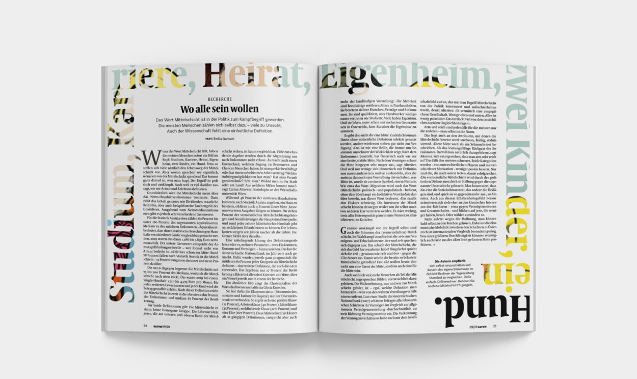 Es gibt also nicht die eine Mitte. Zusätzlich können Daten ohne einheitliche Definition selektiv genutzt werden, andere wiederum stehen gar nicht zur Verfügung. › Das ist wie eine Brille, die immer nur bestimmte Ausschnitte der Wirklichkeit zeigt. Nach dem Einkommen beurteilt, hat Österreich nach wie vor eine breite, stabile Mitte. Nach dem Vermögen schaut die Mitte hingegen sehr mager aus ‹, sagt Altreiter. Und weil nur wenige sich theoretisch mit Definitionen auseinandersetzen und sie aushandeln, aber die meisten dennoch eine Vorstellung davon haben, was Mitte ist, wurde sie zu einem Symbol, einem Narrativ. Wie etwa das Wort › Migration ‹ wird auch das Wort › Mittelschicht ‹ politisch – und populistisch – bedient, ohne dass überhaupt ein kollektives Verständnis darüber besteht, was dieses Wort bedeutet. › Das macht den Diskurs schwierig. Die Interessen der Mittelschicht können deswegen weder von ihr selbst noch von anderen klar vertreten werden. Es wäre wichtig, trotz aller Heterogenität gemeinsame Nenner zu identifizieren ‹, so Kutscher.