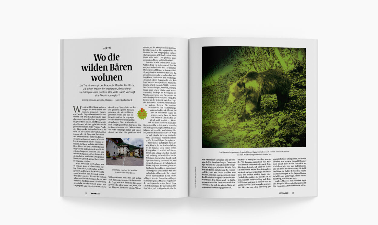 Strembo ist ein kleines Dorf in der Val Rendena, ein mitten durch den Naturpark verlaufendes Tal. Die meisten Menschen und Häuser in Strembo sind alt, es gibt viele renovierte Höfe und dazwischen aufwändig gestaltete Bed and Breakfasts, außerdem ein Weltkriegsdenkmal, einen Supermarkt, ein Rathaus und das Naturparkhaus Adamello-Brenta. Würde man die Wälder um das Dorf herum röntgen, wer weiß, wie viele Bären man sehen würde, sagt Marco Armanini, Zoologe im Naturpark, in Windstopperweste und Cargohose, als er in den Jeep des Naturparks steigt. Der Jeep ist an der Seitentür mit dem Logo des Naturparks versehen : einem Bären vor grünen Bergen.
