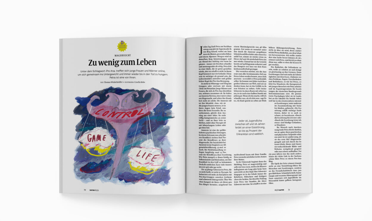 Unter dem Schlagwort › Pro Ana‹ treffen sich junge Frauen und Männer online, um sich gemeinsam ins Untergewicht und immer wieder bis in den Tod zu hungern. Petra ist eine von ihnen.
