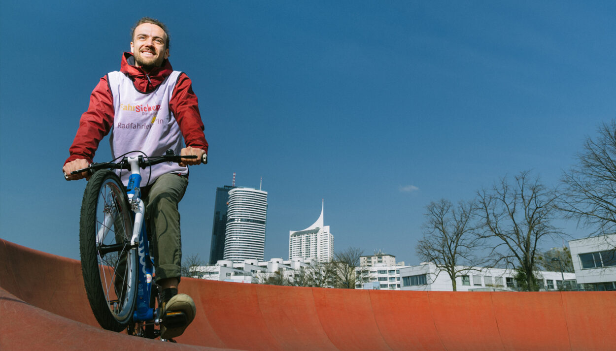 Ich habe die Stelle in der Facebook-Gruppe ›Radfahren in Wien‹ gesehen. Das hat mich sofort angesprochen. Fahrradfahren zum Beruf machen zu können, klang ziemlich cool. Ich hatte vorher schon pädagogisch gearbeitet, das klang nach einer guten Möglichkeit, meine Leidenschaft für das Fahrradfahren und die Arbeit mit Kindern zu vereinen.